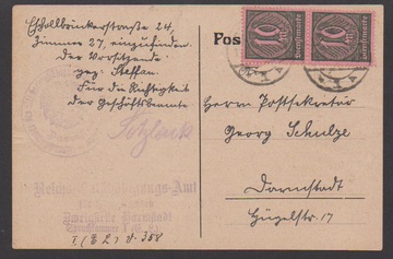 10 Mk., zwei versch. Mehrfach-Frankaturen: per zwei auf Ortskarte aus Darmstadt, sowie im Viererblock auf Streifband, typische Gebrauchsspuren
