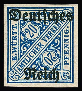 20 Pfg. Ausgabe für Württemberg, Abart sowohl Wasserzeichen "Ringe" als auch ungezähnt tadellos postfrisch, sign. Hederer, Pfenninger und Attest Winkler. Mi. 500,-
