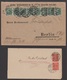 Vier bessere portoger. Mehrfach-Frankaturen: 5 Pfg. zweimal per acht auf Orts- und Fernbriefen, 50 Pfg. per drei (einmal PF I) auf Postkarte, sowie 1 Mk. im Paar auf Fernbrief