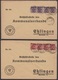 Drei bessere Mehrfach-Frankaturen: 50 Pfg. per fünf auf Paketkarte, 1,25 Mk. per sechs auf Zustell-Urkunde, sowie per 12 auf Postkarte