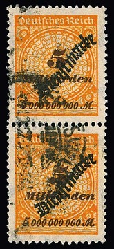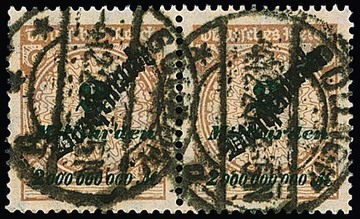 2 Milld. Mk. Schlangenaufdruck sowohl einzeln als auch im Paar, sowie 10 Milld. Mk., je gest., sign. Düntsch bzw. Fotoexp. Fleiner. Mi. 630,-