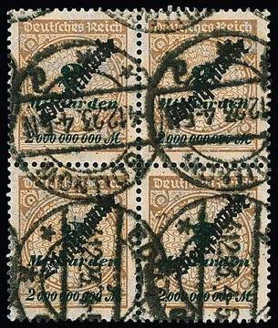2 Milld. Mk. Schlangenaufdruck im gest. Viererblock, dabei rechte obere Marke mit Plattenfehler "Sprung in der Rosette", sign. Düntsch, Infla. Mi. 1200,-
