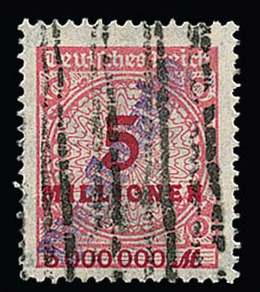 Dienst-Kontrollaufdrucke auf Freimarken mit violettem Handstempel "Regierung", 5 Mill. Mk. gestempelt, gering verkürzte Zähne, seltene Marke, sign. Peschl. Mi. "-.-"