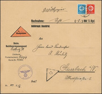 8 u. 20 Pfg. Dienst als sehr seltenes 28-Pfg.-Porto auf Brief "Nachnahme-Geschäftspapiere" (8 Pfg. min. Gummispuren), diese Portorate kommt mit Dienstmarken sonst nicht vor!