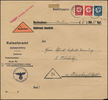 4 Pfg. und zweimal 12 Pfg. als sehr seltene 28-Pfg.-Portorate auf Brief "Nachnahme Geschäftspapiere" aus dem sächsischen Schwarzenberg, trotz kleiner Mängel sehr selten, da diese Portorate sonst nicht mit Dienstmarken vorkommt!