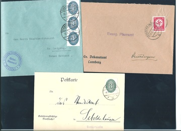 Drei gute Belege: 8 Pfg. Ziffern und 12 Pfg. Behördendienst (sign. Oechsner) je in guter Farbe als portoger. EF, sowie 4 Pfg. Strohhut per drei als Mehrfach-Frankatur. Mi. über 420,-