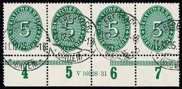 5 Pfg. Strohhut, sauber gestempelter Unterrand-Viererstreifen mit bisher im Michel unbekannter Hausauftragsnummer "V 16928.31", sehr selten!