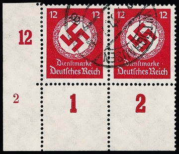 12 Pfg. Behördendienst im gestempelten Paar aus der linken unteren Bogenecke mit seltener Platten-Nr. "2" (Michel unbekannt!)