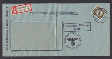 30 Pfg. Behördendienst als ungewöhnliche Einzelfrankatur auf Fenster-R-Brief (Mittelfalte ausserhalb) gg. Rückschein "Frei durch Ablösung Reich" aus Düsseldorf 1938, an sich portofrei, nur die Einschreibe- und Rückscheingebühr verklebt