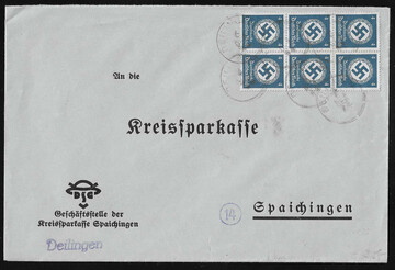 4 Pfg. Parteidienst im Sechserblock als portoger. hohe MeF auf Sparkassen-Bedarfsbrief aus Deilingen