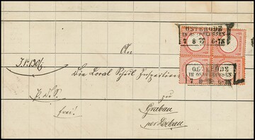1/2 Gr. ziegelrot, zwei Prachtpaare (ein Eckchen min. getönt) auf Briefvs. mit Ra3 "Osterode in Ostpreussen". Mi. lose 300,-