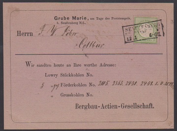1/3 Gr. grün, perfektes Exemplar auf dekor. rosa Vertreterkarte (der "Grube Marie") aus Senftenberg, sign. Krug