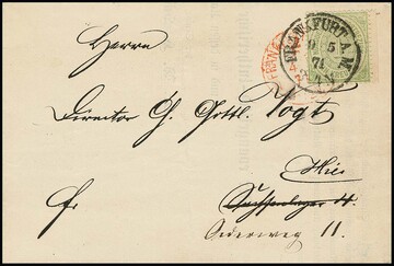 1871, sehr ungewöhnlicher "Ersttagsbrief" der Reichspost, erst am 4.5.1871 mit rotem Franko-K1 "Frankfurt a.M." als Orts-Drucksache gelaufen, nicht zustellbar, am 9.5.71 Randstück NDP 1 Kr. grün nachfrankiert und erneut zugestellt
