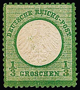 1/3 Gr. grün, tiefe, fast b-Nuance, ungebraucht, kleine helle Stellen, mit auf dieser Marke nicht häufigem Schraubenkopfabdruck im Prägefeld, Attest Zill. Mi. 1300,-