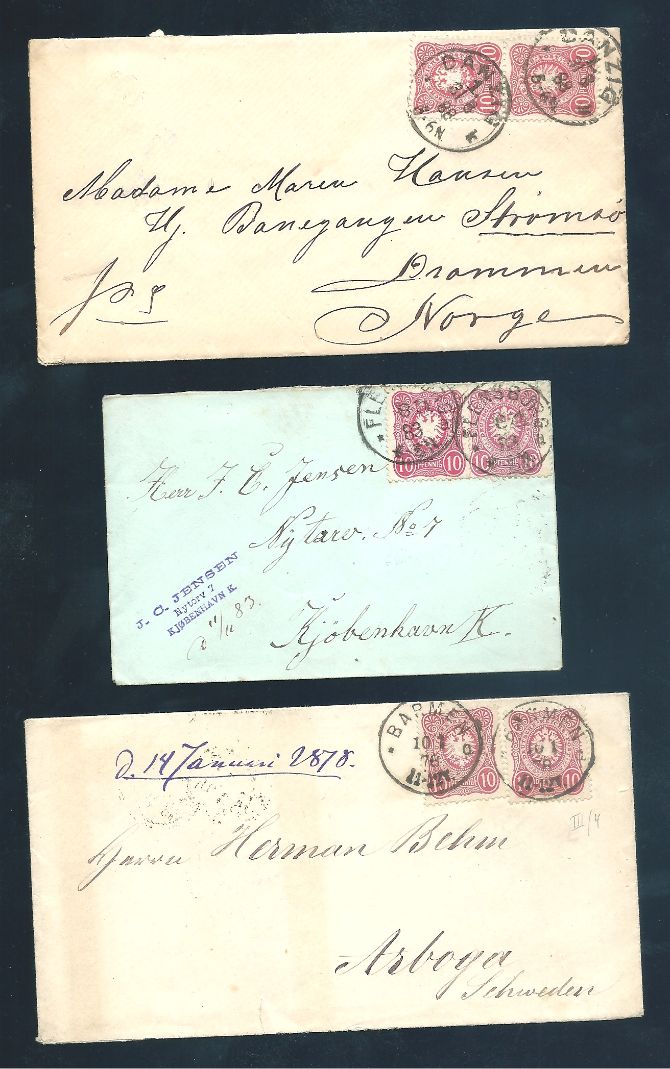 10 Pfge. bzw. zweimal 10 Pfg. je per zwei auf drei Skandinavien-Briefen, 1879 nach Stockholm, 1883 nach Kopenhagen (stärkere Gebrauchsspuren) und 1885 nach Drammen/Norwegen