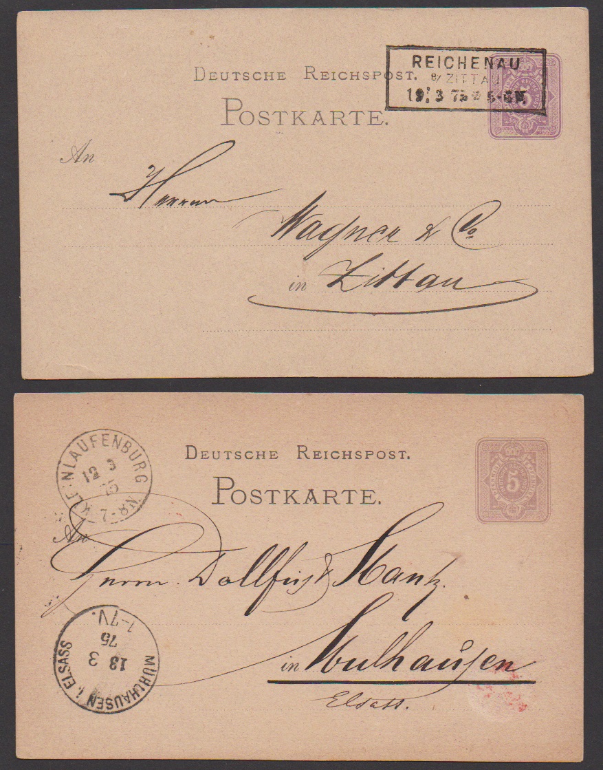 Zwei Ganzsachenkarten 5 Pfg. gebraucht, vom 12.3.75 mit Entwertung neben dem Wertstempel (lt. Verfügung No. 55 vom gleichen Tage sollte jedoch der Wertstempel ab jetzt entwertet werden), sowie korrekt entwertet am 19.3.75