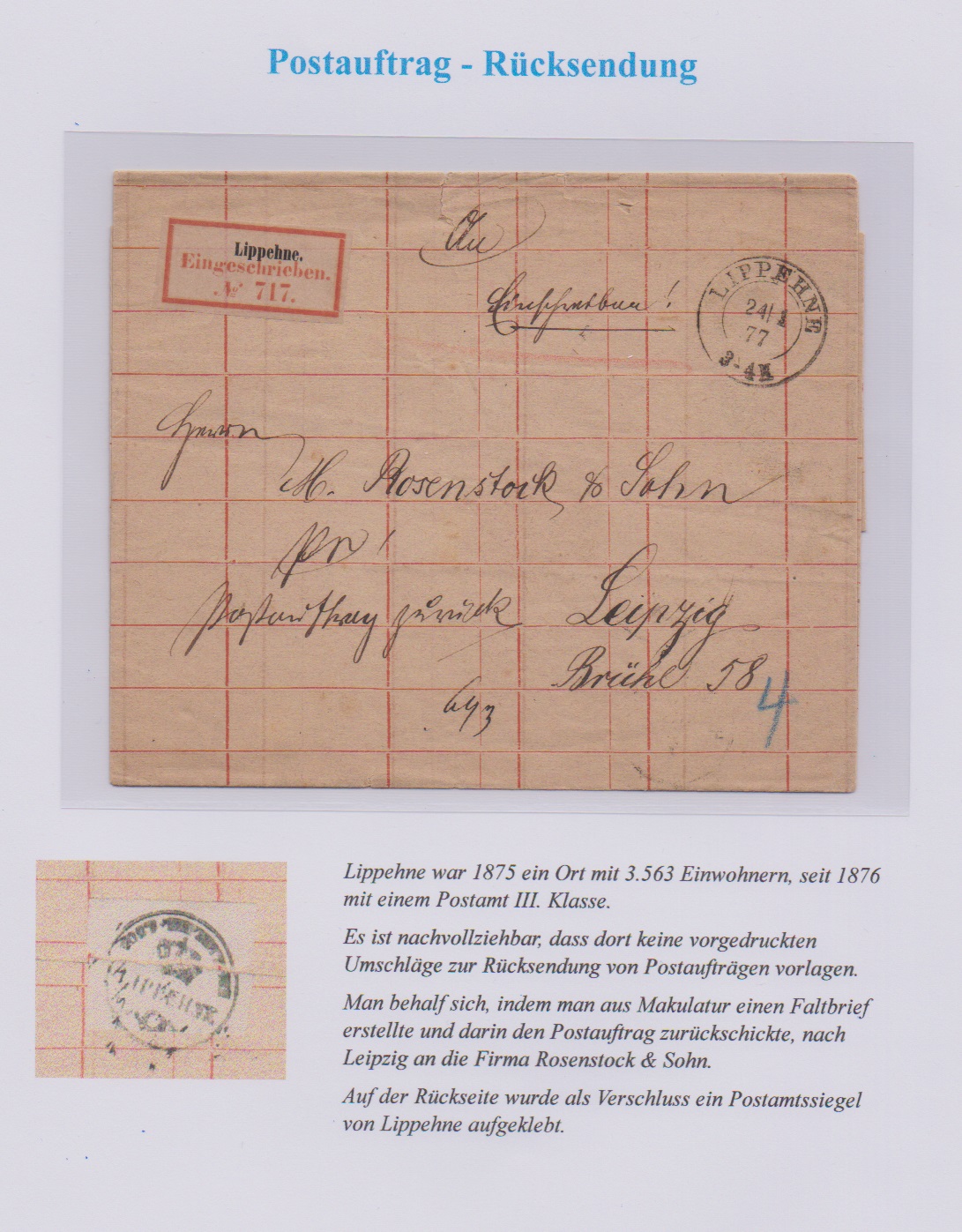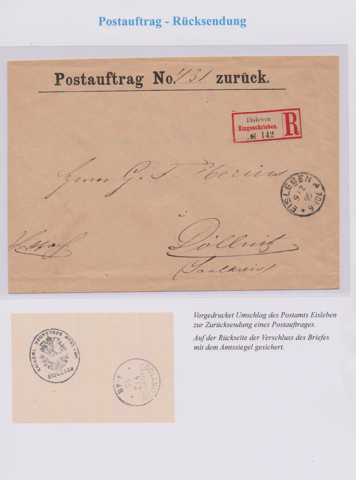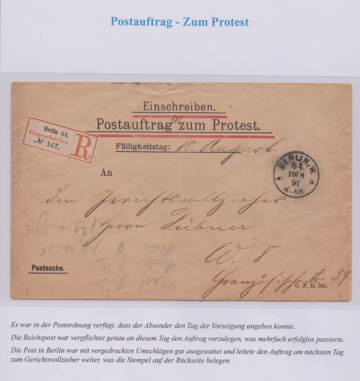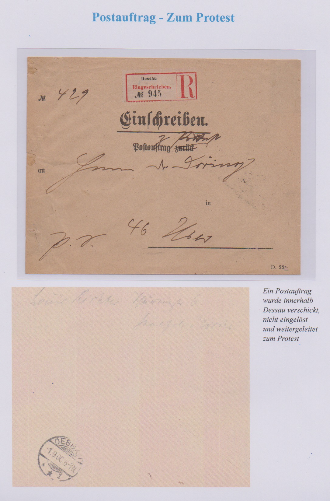 1877-1891, sechs unfrankierte Postauftrags-R-Briefe, "Postauftrag zurück", "Zum Protest" etc.