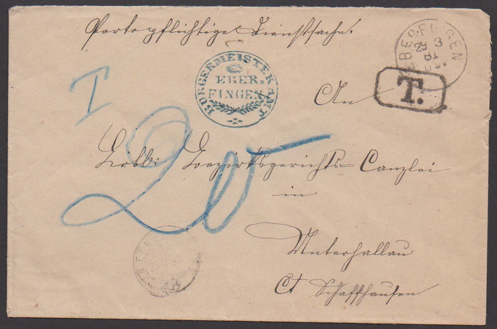 Drei Grenzrayon-Briefe aus Baden in die Schweiz: mit 10 Pfge. von Grafenhausen nach Schaffhausen, mit 10 Pfg. von Wehr nach Basel (Couvert rs. ohne eine Viertelklappe), sowie unfrankiert und nachtaxiert 1881 von Eberfingen nach Schaffhausen