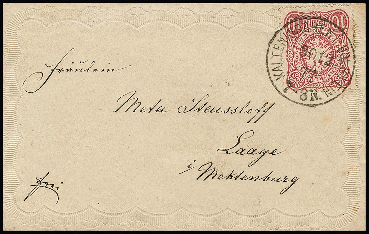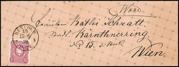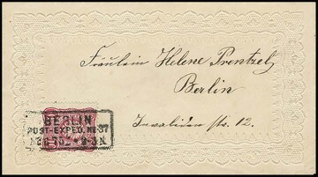 10 Pfge. karminrosa auf besonders schön und opulent geprägtem Orts-Präge-Zierbrief aus Berlin