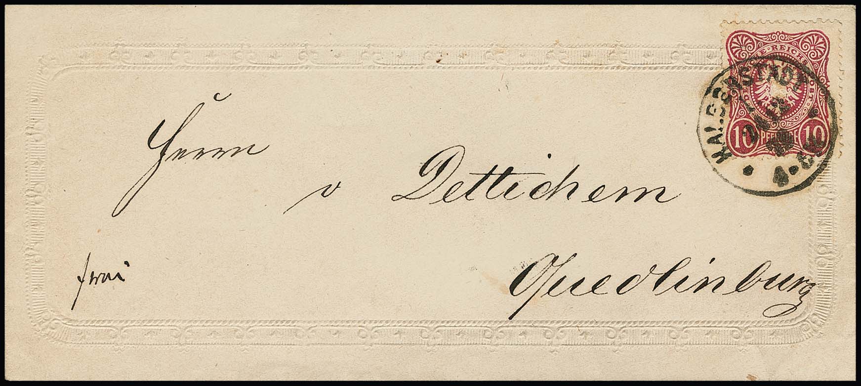 10 Pfge. karmin (leichte Tönung) einzeln auf hübschem Präge-Zierbrief aus Halberstadt