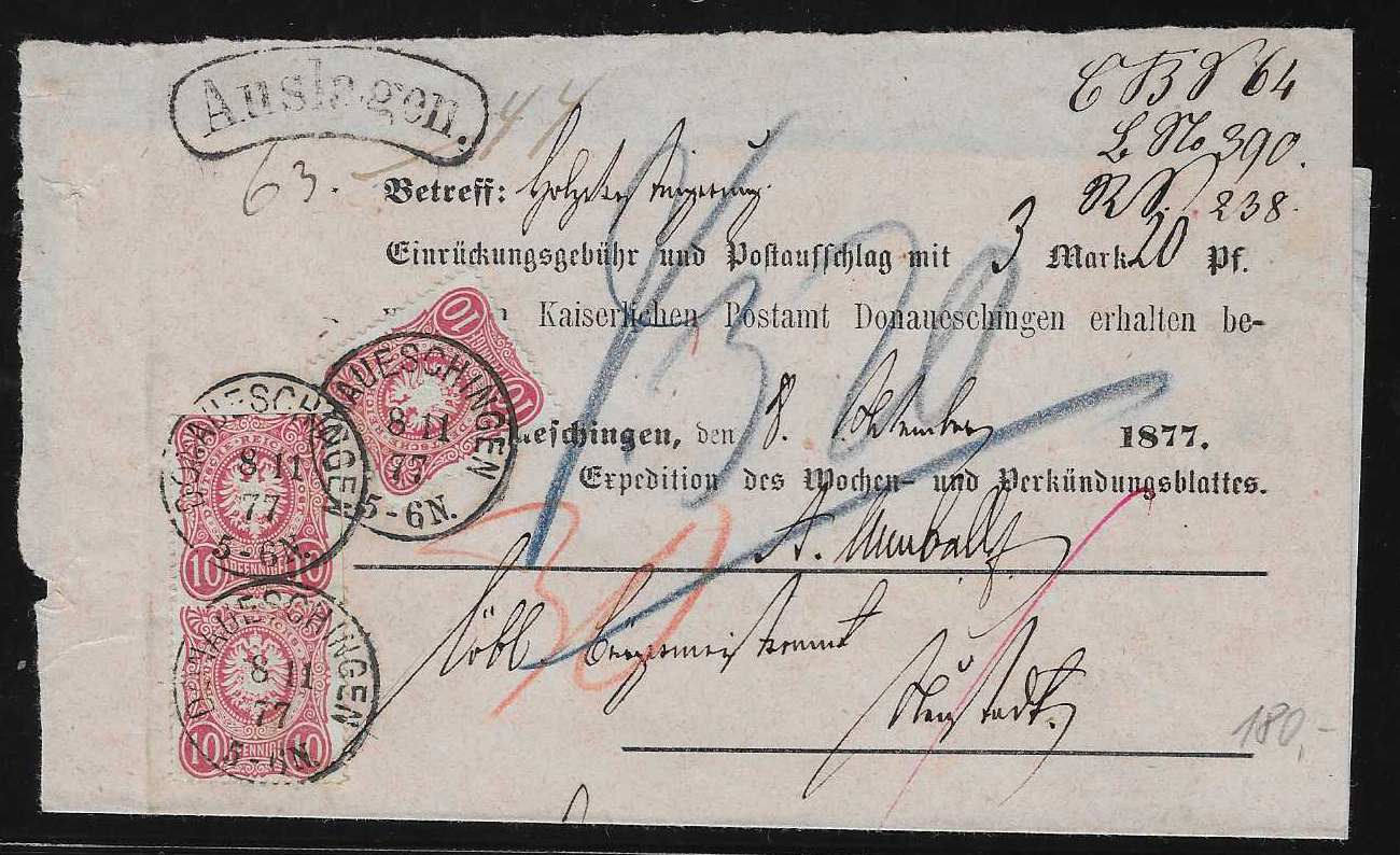 10 Pfge. rosa per drei (einmal Scherentrennung) auf Vordruck-NN-Adresse aus Donaueschingen 1877