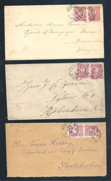 10 Pfge. bzw. zweimal 10 Pfg. je per zwei (einmal kurios von zwei deutlich versch. Auflagen) auf drei Briefen 1878-88 nach Skandinavien, nach Asboga/Schweden, Drammen/Norwegen und Kopenhagen