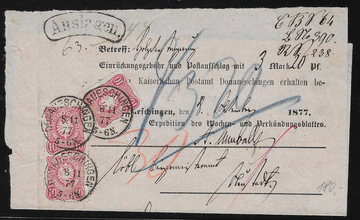 10 Pfge. rosa per drei bzw. 10 u. 20 Pfge., auf zwei eingeschriebenen Postaufträgen, 1877 aus Leipzig und 1879 aus Rostock (hs. "Sofort zu Protest")