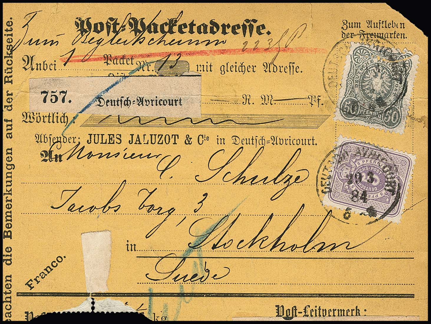 50 Pfg. olivgrau, zwei Zehnerblöcke (zwei Werte kleine Mängel, etwas angetrennt) auf großem Teil einer Auslands-Paketkarte nach Stockholm (rs. 50 Pfg. mit Mängeln und 5 Pfg.), dabei je einmal Plattenfehler III und IV
