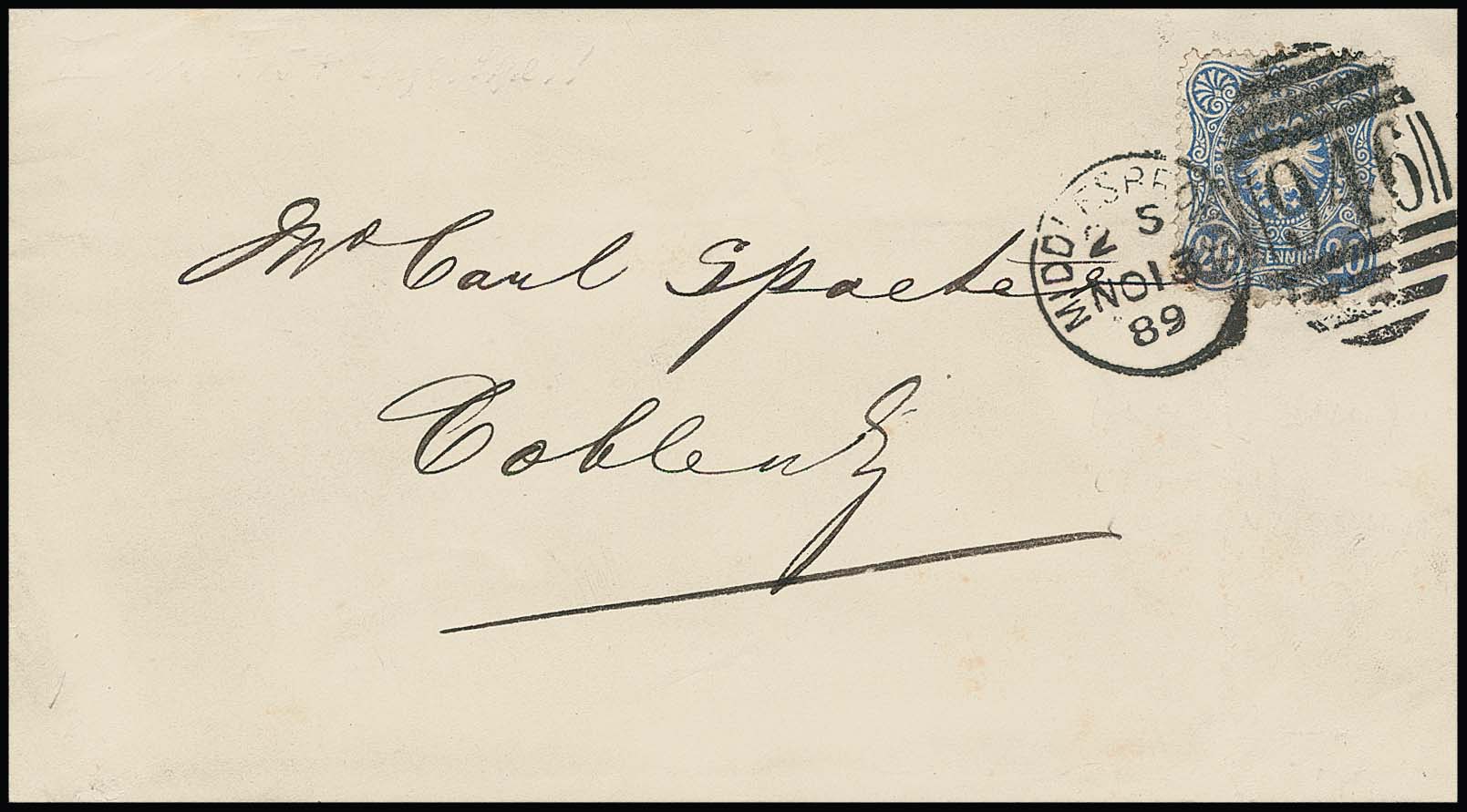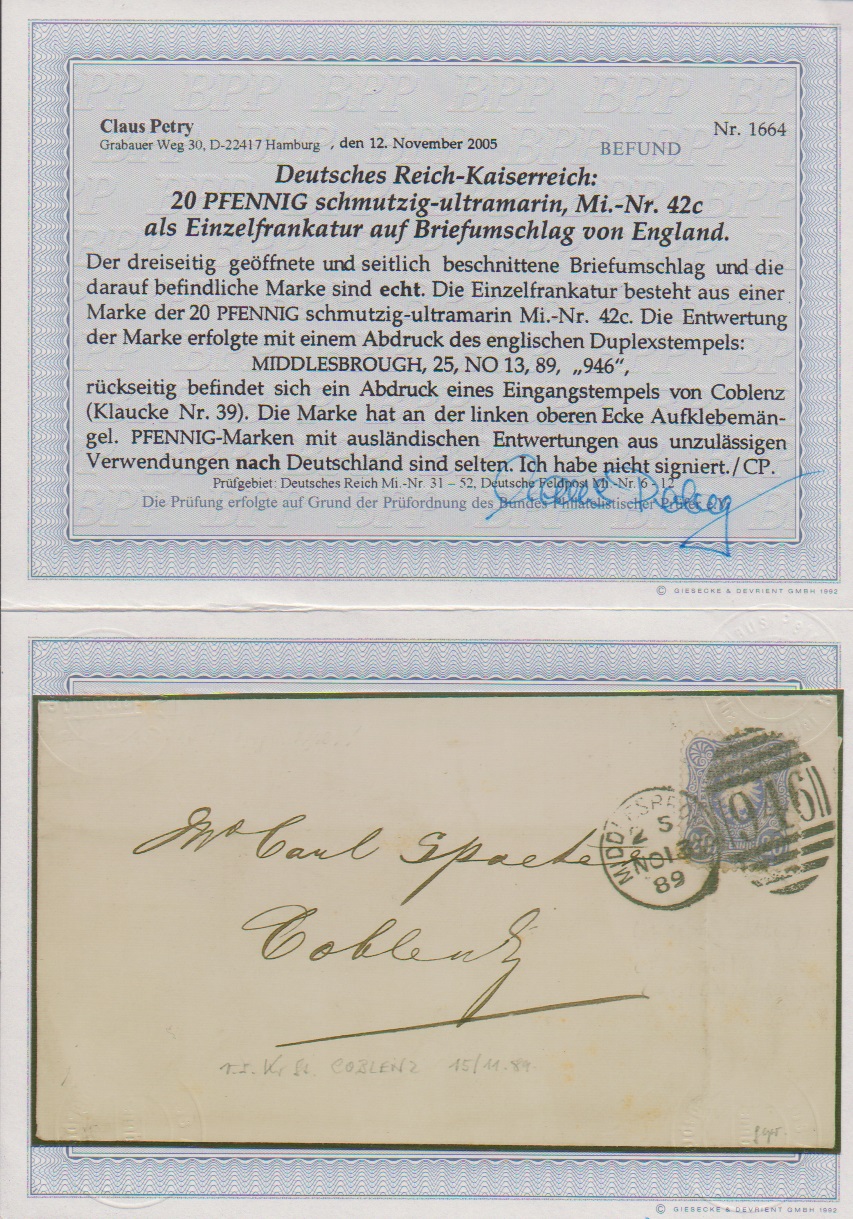 20 Pfg. grauultramarin (links unten Aufklebefehler) einzeln auf Couvert mit englischer Fremdabstempelung von Middlesbrough 1889 (NS "946") nach Coblenz ohne Nachtaxe, sign. Hartmann und Fotoexp. Petry