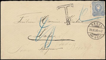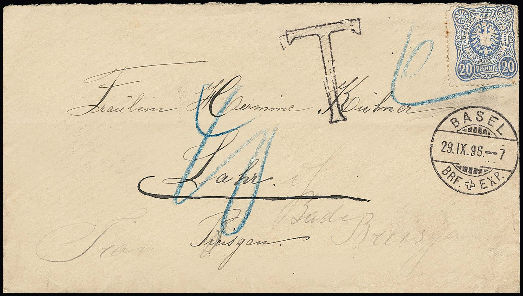 20 Pfg. (kl. Mgl.) spät nach Gültigkeit und zusätzlich im Ausland verwandt auf Couvert 1896 aus Basel mit Nachtaxe nach Lahr