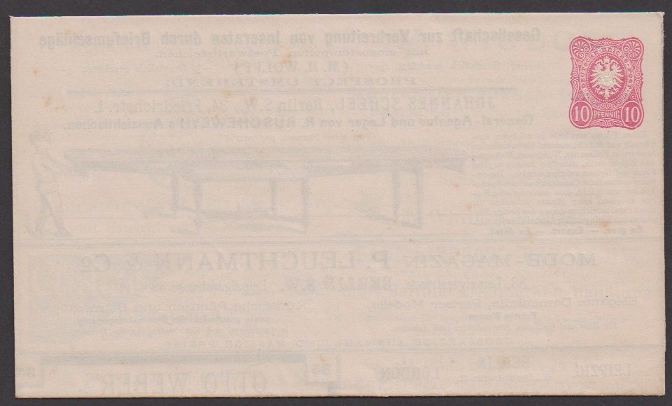 Anzeigen-Faltbrief-Ganzsache 10 Pfg. der Fa. Wolff/Grunert, Berlin ungebraucht, selten! Meier zu Eissen 2B1, Auflage 10.000 Ex.