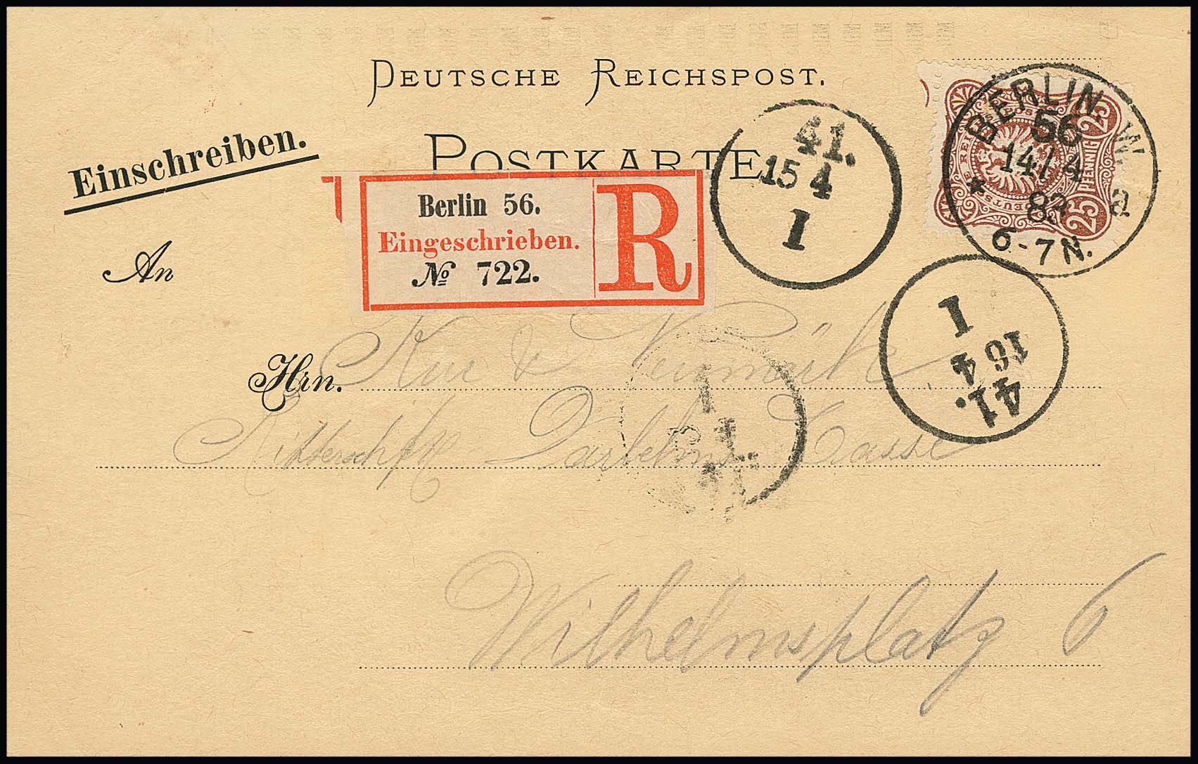 Zwei eingeschriebene Orts-Postkarten aus Berlin, 1883 mit 25 Pfg. braun einzeln, sowie 1899 mit 20 Pfg. auf 5 Pfg.-Karte