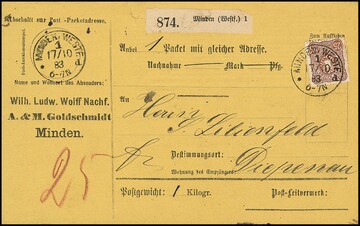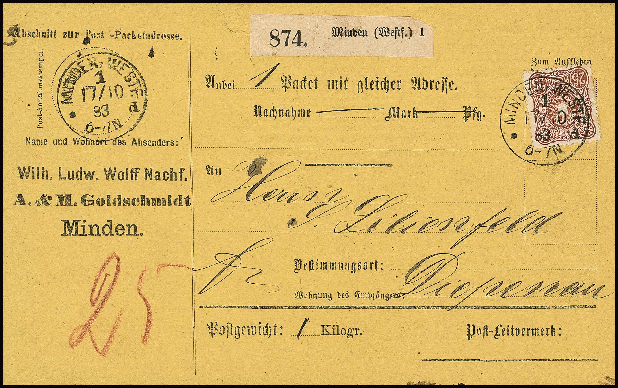 25 Pfg. ockerbraun einzeln auf gelber Inlands-Paketkarte von Minden 1883 nach Diepenau