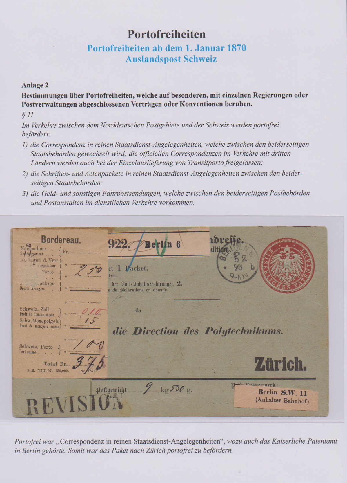 1898, portofreie Auslands-Paketkarte "Kaiserliches Patentamt" mit entspr. rotem Adler-Eindruck nach Zürich