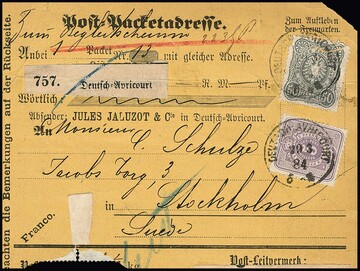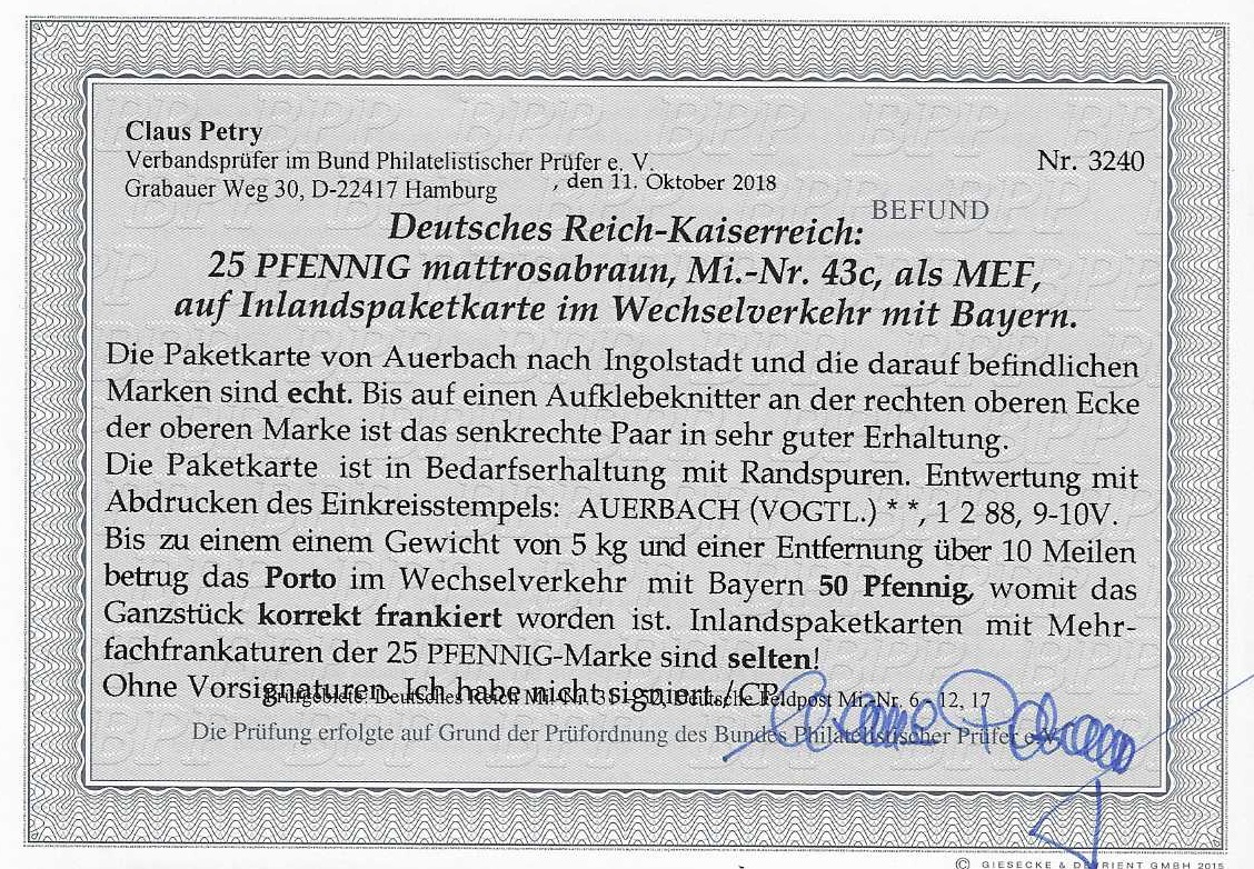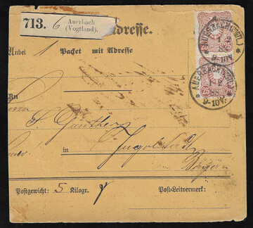 25 Pfg. orangebraun im Paar (obere Marke unbed. Eckknitterung) als MeF auf Paketkarte von Auerbach 1888 nach Bayern, lt. Fotoexp. Petry mit Mehrfach-Frankaturen dieser Marke selten!