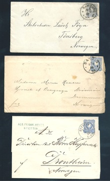 20 Pfg. je einzeln auf drei Briefen in versch. Norwegische Orte 1880-86, einmal Brief stärkere Gebrauchsspuren