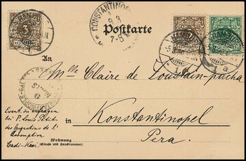 Fünf Karten (zwei Ganzsachen) je in die Türkei mit Ankunftsstempel des Deutschen Auslands-PA, dabei eine mit Weiterleitung über das französische Postamt in Galata