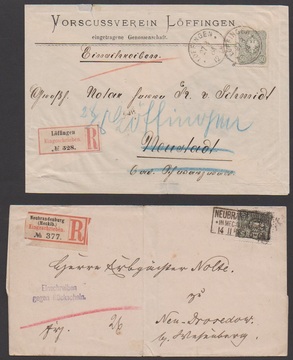 50 Pfg. grauoliv einzeln auf R-Brief aus Löffingen 1884 mit Weitersendung, offensichtlich in Unkenntnis der Tarife für eine erhöhte Gewichtsprogression frankiert, sowie 50 Pfg. dunkelgrün einzeln auf R-Brief gg. Rsch. aus Neubrandenburg 1884 (20 + 20 + 10), Brief Mittelfalte ausserhalb