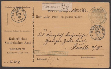 1889, portofreie Inlands-Paketkarte mit Vordruck und Siegelstempel des Statistischen Amtes als "Reichs-Dienst-Sache" (Ra1) nach Fürth