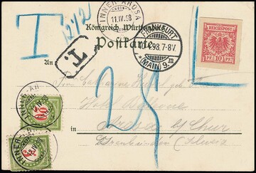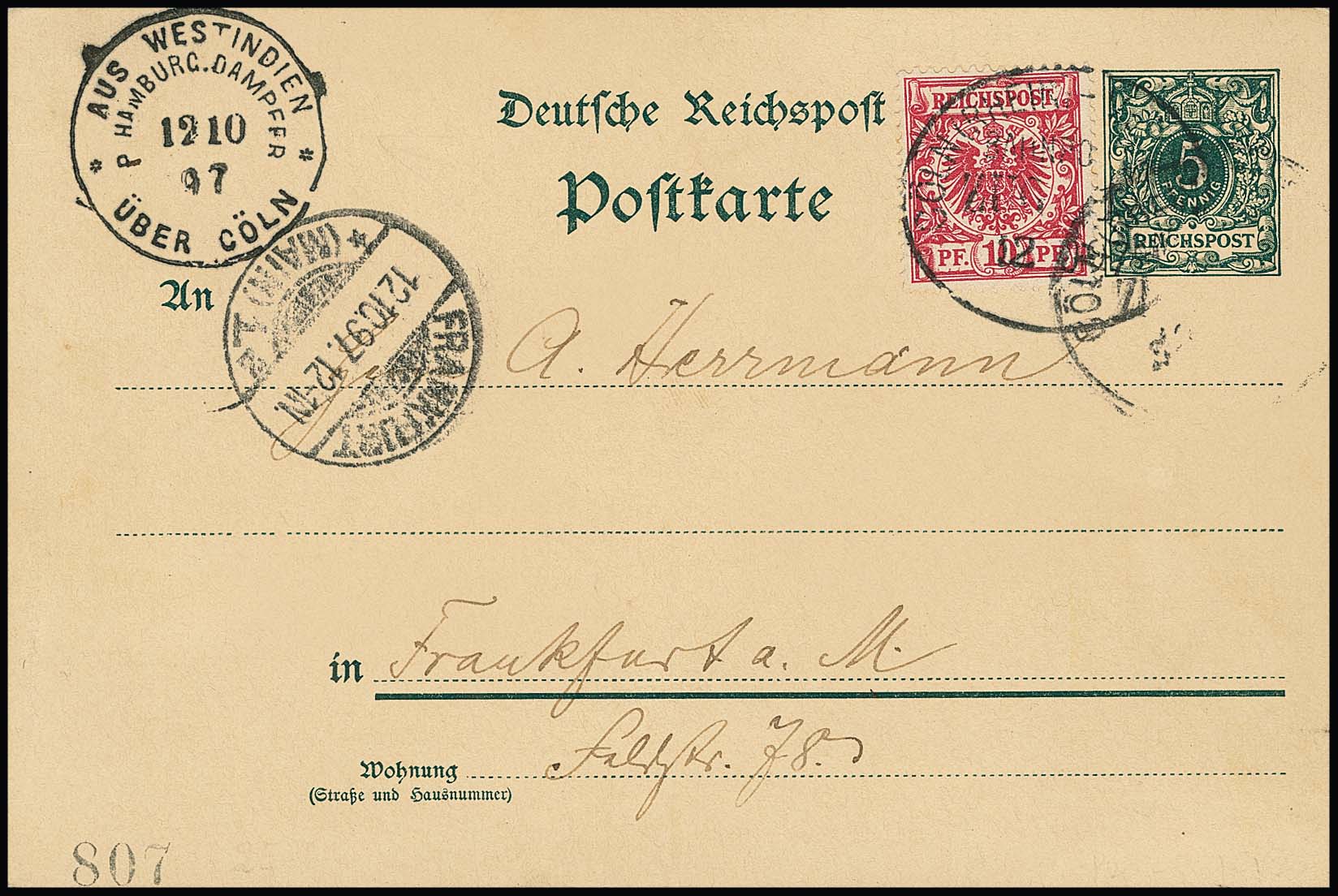 10 Pfg. auf Ganzsachenkarte 5 Pfg., geschrieben 1897 in Vera Cruz/Mexiko, mit seltenem K1 "Aus Westindien p. Hamburg. Dampfer über Cöln" nach Frankfurt (mit BP-Stempel als Entwertung)