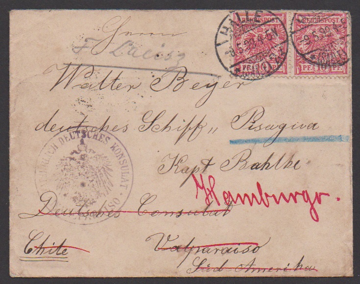 10 Pfg. per zwei auf Couvert (Gebrauchserhaltung) von Halle/S. 1899 an einen Passagier auf dem deutschen Schiff "Pisagua" in Chile, da das Schiff aber ausgelaufen war, wieder zurück nach Hamburg, seltener langer Laufweg!