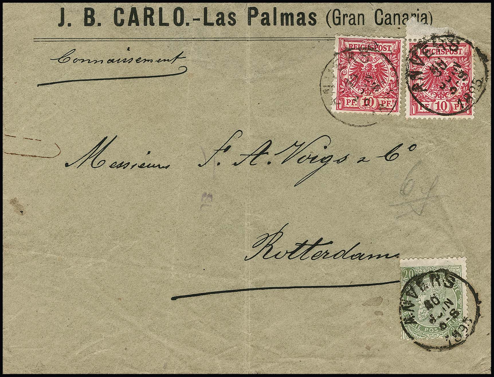 10 Pfg. per zwei auf Couvert (Vordruck aus Gran Canaria!), 1895 im belgischen Antwerpen verwandt mit korrekt zufrankierter belgischer 20 C. grauoliv und K1 "Anvers" nach Rotterdam, übliche Gebrauchsspuren, hs. "Connaissement"