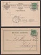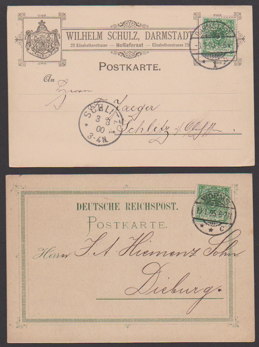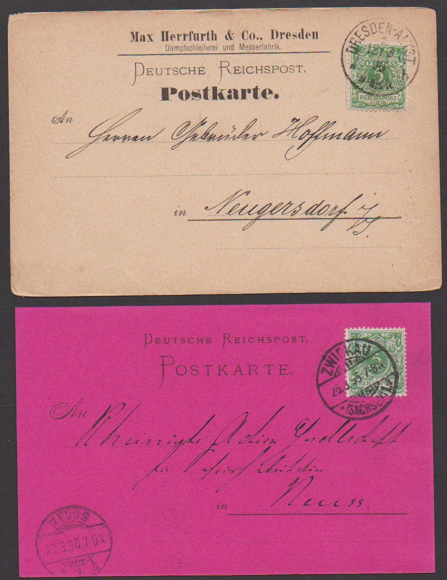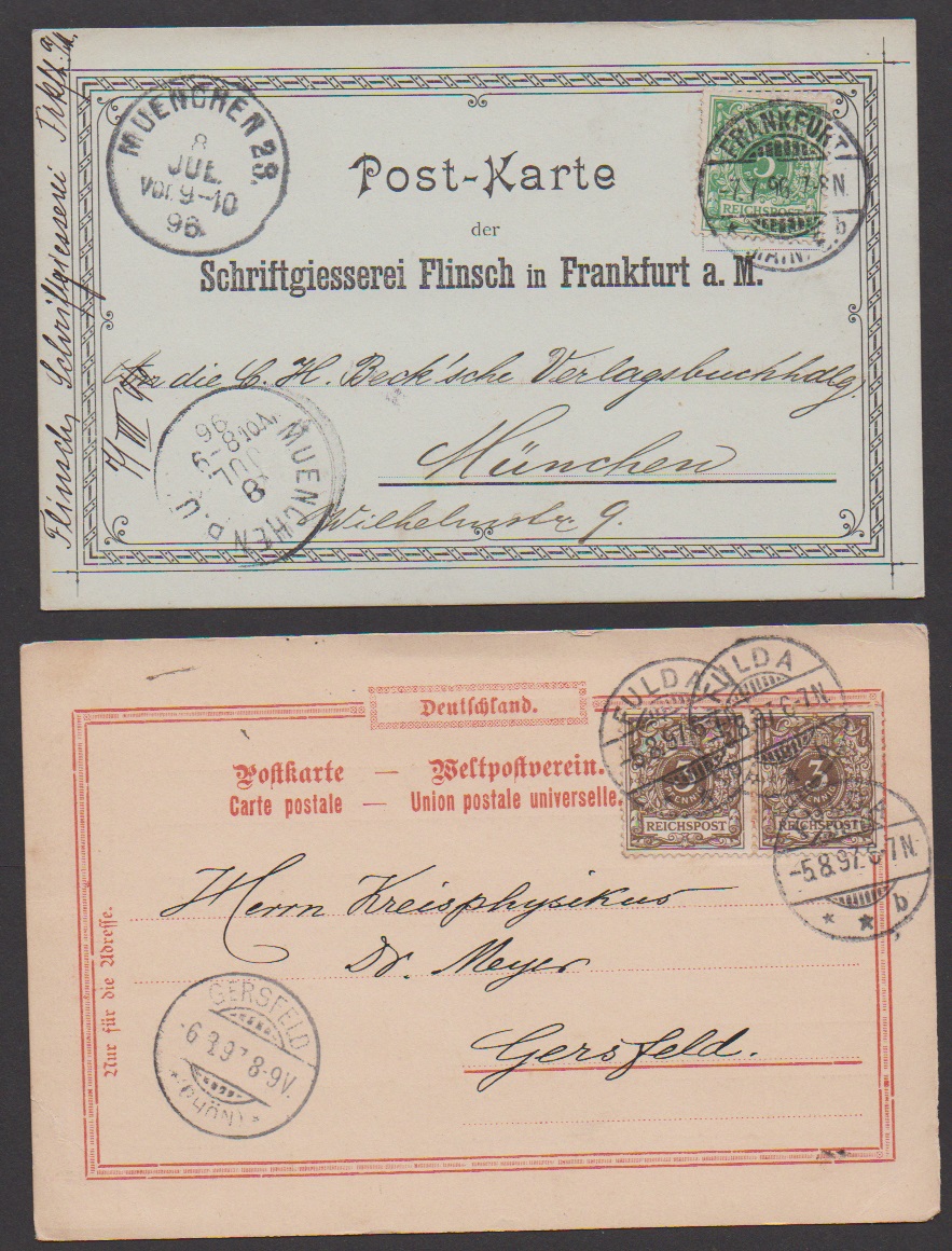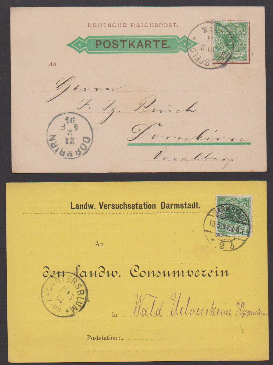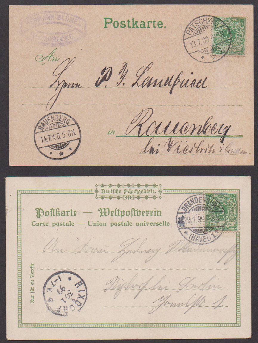5 Pfg. elfmal einzeln, einmal 3 Pfg. per zwei, auf insgesamt zwölf dekorativen Privat-Postkarten, dabei Colorkarte "Deutsche Schutzgebiete", frühe vierfarbige Essig-Werbekarte, Karten in gelb, orange und rot etc.