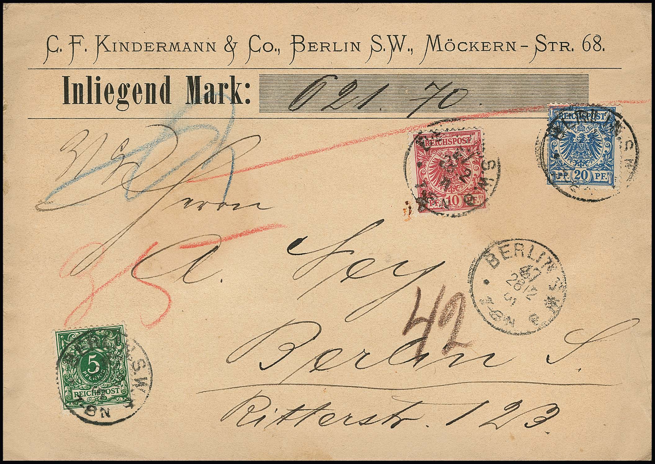 5, 10 u. 20 Pfg. auf seltenem Orts-Wertbrief aus Berlin 1891, leichte Gebrauchsspuren