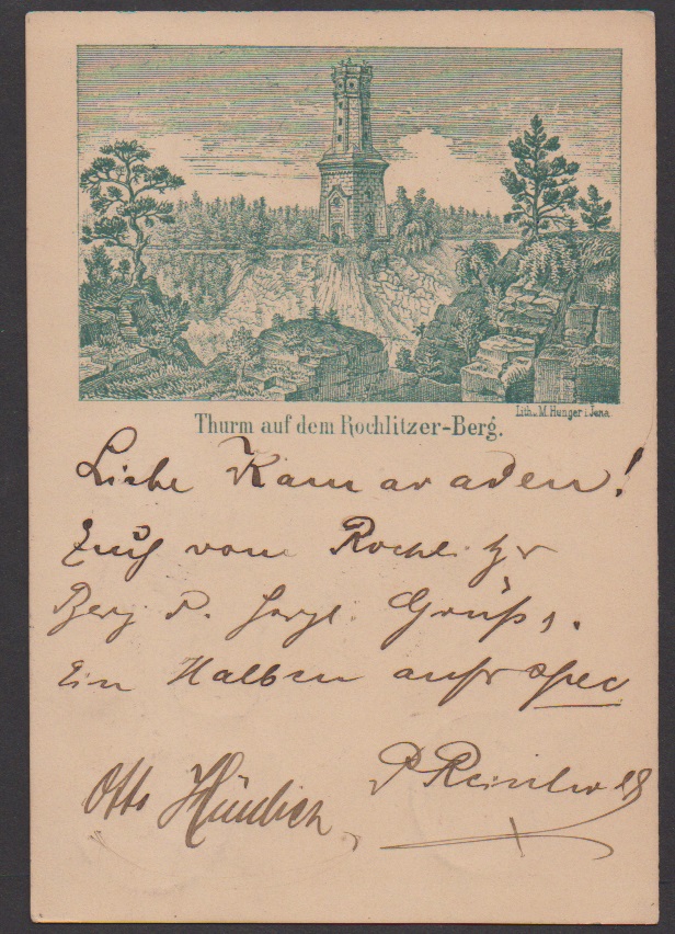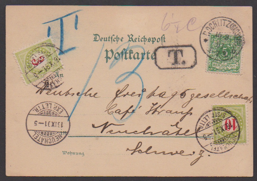 5 Pfg. einzeln auf sehr früher Ansichtskarte aus Rochlitz 1891, Abb. "Thurm auf dem Rochlitzer-Berg", in die Schweiz mit französ. Nachportomarken