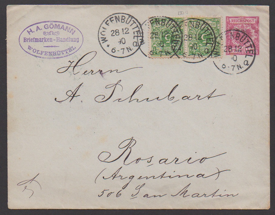 5 Pfg. im Paar auf großform. Ganzsache 10 Pfg. (min. getönt), von Wolfenbüttel 1890 nach Rosario/Argentinien, sign. Wiegand