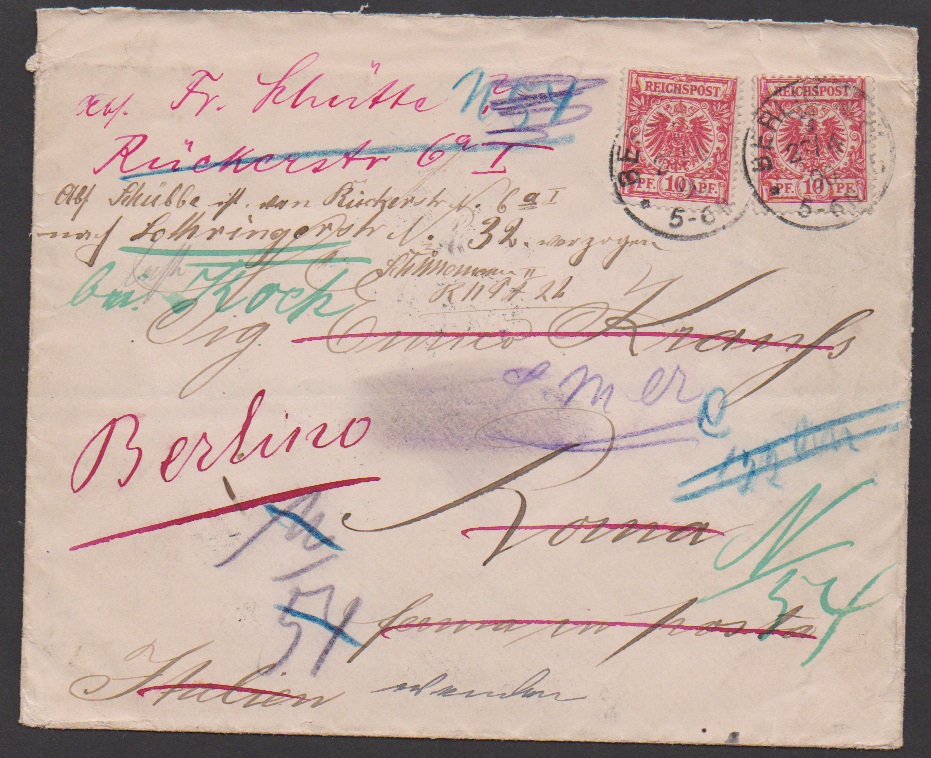 10 Pfg. per zwei auf Brief 1890 von Berlin nach Rom und mit zahlreichen Vermerken zurück, rs. zwei Verschluß-Vignetten der OPD Berlin
