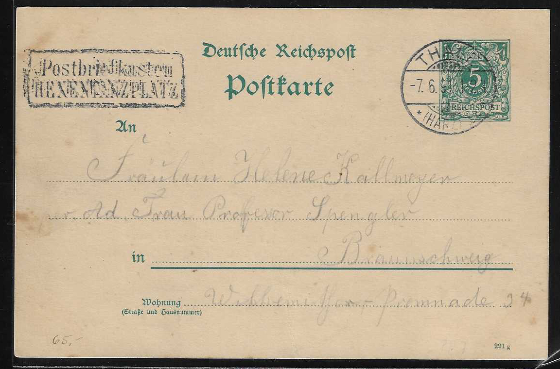 Frühe Privat-Ganzsachenkarte 5 Pfg. Krone-Adler als Ansichtskarte 1891 "Gruss vom Hexentanzplatz i. Bodethal" gebraucht mit Nebenstempel "Postbriefkasten Hexentanzplatz", leichte Gebrauchsspuren