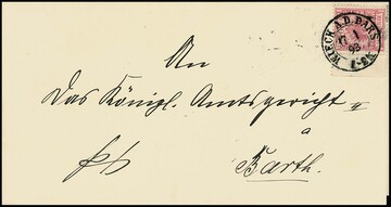 Nachverwendete Stempel auf Krone-Adler, sieben Belege sowie 15 lose Marken und einige Beigaben mit nachverw. Stempeln, dabei seltene, u.a. K2 "Bisperode" und "Wieck a.d. Dars" auf Brief, letzterer Randstück (!) 10 Pfg.