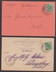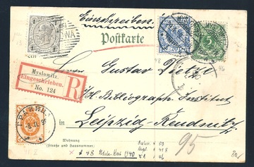 5 Pfg. (min. Zahnspitzen-Patina) und 20 Pfg. auf Einschreibe-Postkarte 1899 aus Myslowitz, sog. "Drei-Länder-Karte" mit zusätzlich Österreich Nr. 50 und Rußland Nr. 45